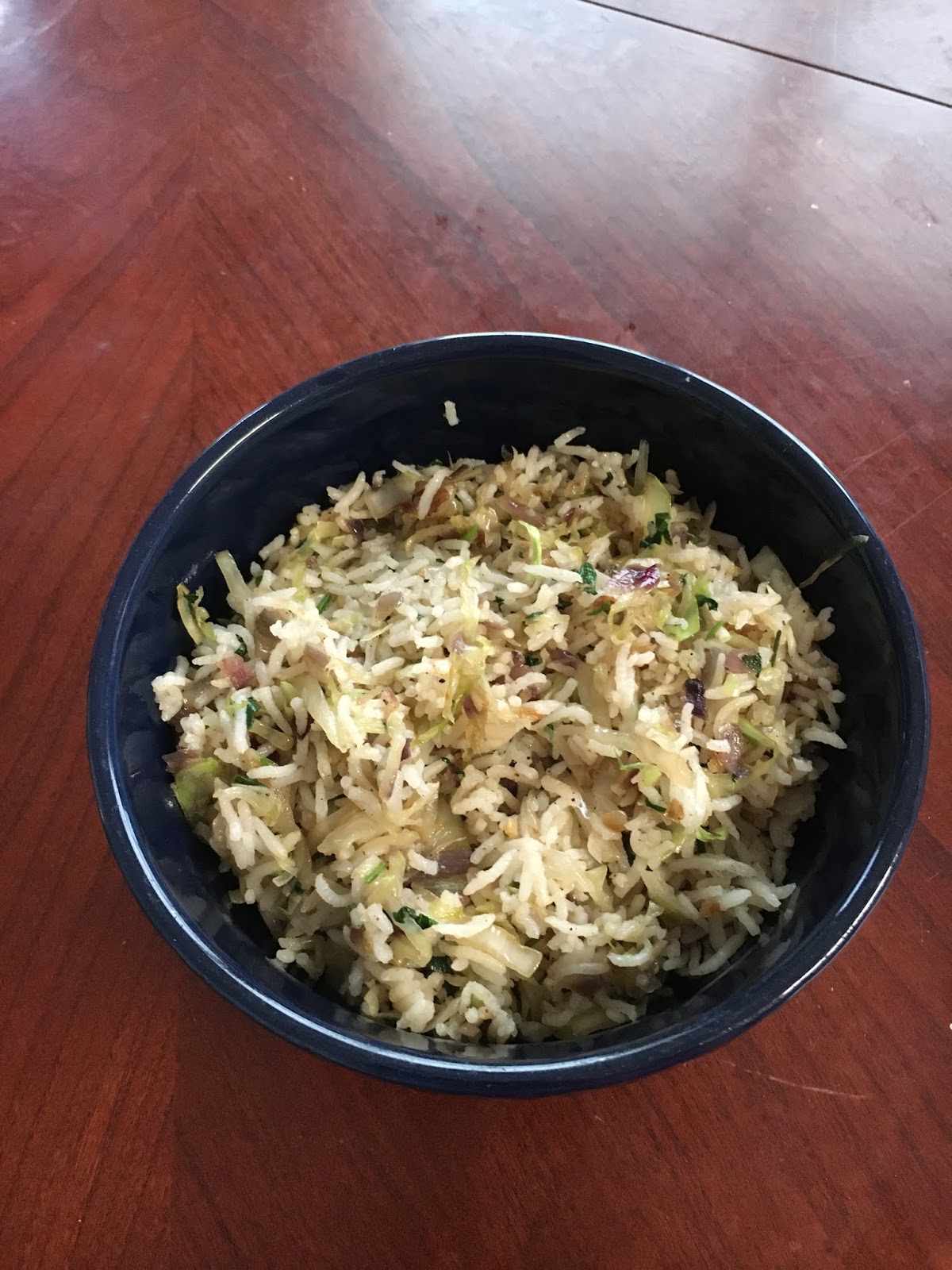 Ingredients 1/2 of a medium size cabbage Basmati rice - 1 cup Garlic. - 4 Ginger. - 1 inch Coriander leaves. - handful Pepper powder. - 1/4 - 1/2 tsp depending on the spice level Green Chillies. - 1 to 2 Soy sauce. - 1 tsp Oil. - 2 tsp or butter 2 tsp Salt to taste 1. Chop the cabbage into julienne. Chop the garlic, ginger, green chillies and coriander leaves. 2. Cook the basmati rice with salt either on cooker adding 2 to 2 1/2 cups of water in a cooker for 4 whistles or cook on stove top, drain it and keep it 3. In a pan add oil/butter. When the oil is hot keep the flame high and add garlic and ginger saute for few seconds and add chopped onion sand salt. Saute continuously to avoid burning. When the onions are well cooked add chopped cabbage, salt and pepper. Saute continuously. When the cabbage is cooked add chopped coriander leaves and soy sauce. Saute for a while and switch of the flame. Now mix the cooked rice